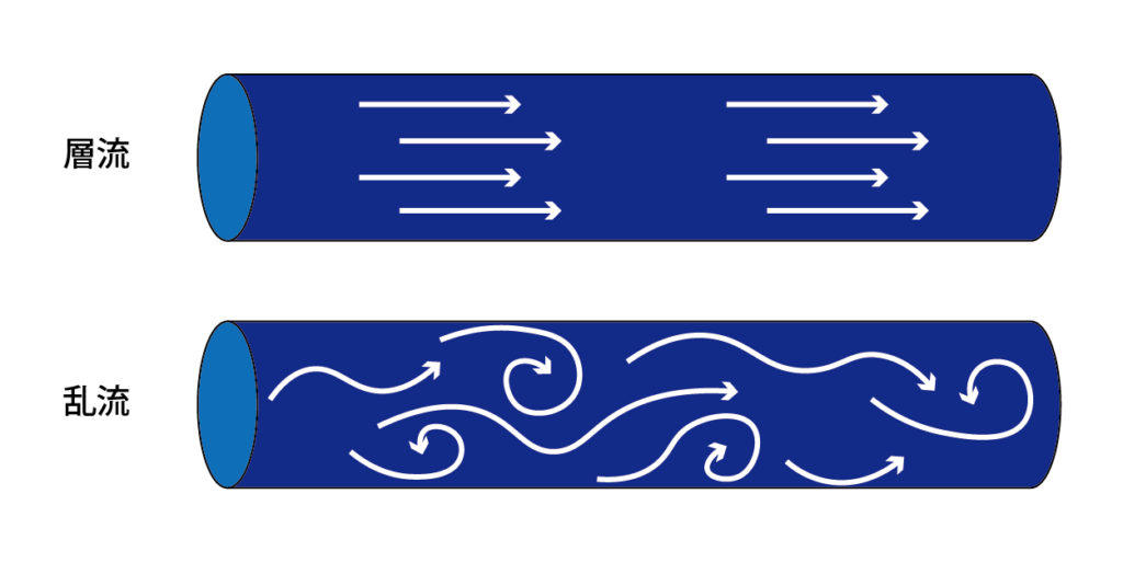 配管内を流れる流体には、整然と流れる「層流」と、渦を巻きながら流れる「乱流」の2つの状態があります。熱交換効率を最大化するには、媒体を「乱流」状態で流すことが鉄則です。