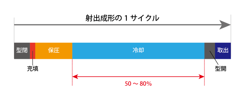 射出成形機のパラメータの中で、最も時間を要するのは「冷却」の工程です。樹脂の種類や肉厚にもよりますが、一般的に成形サイクルの50%〜80%は冷却時間が占めていると言われています。