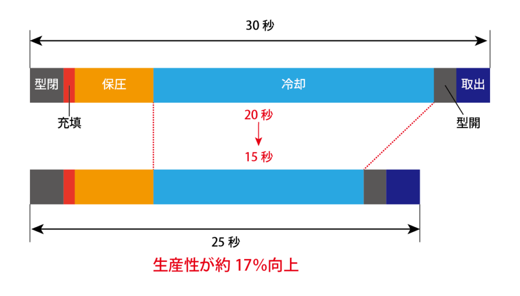 つまり、射出速度や計量時間をコンマ数秒縮める努力よりも、冷却効率を高めて冷却時間を短縮するほうが、生産性向上へのインパクトは遥かに大きいのです。