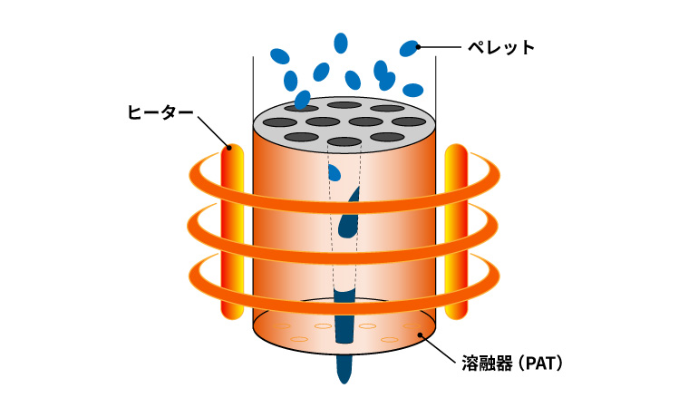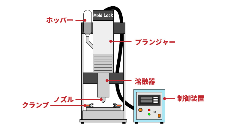 一方、モールドロックにはスクリューが無く、溶融器内部にはヒーターのみが搭載されており、溶融した樹脂がプランジャーによってノズルから吐出されます。