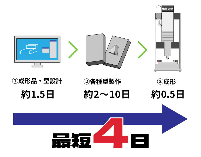 従来なら数週間を要した試作品の製作が、モールドロックなら最短4日で完了できます。さらに3Dプリンターでは1日数個しか造形できない場合でも、モールドロックなら1日200~300個程度の成形が可能です。