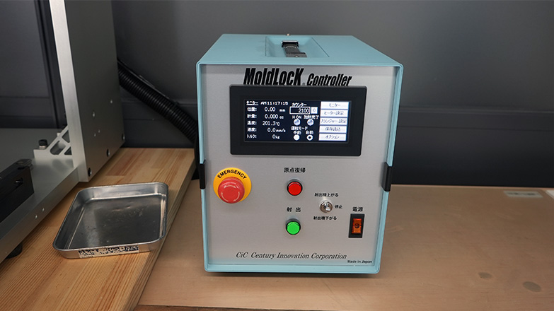 モールドロックは、センチュリーイノヴェーションが開発した卓上型射出成形機です。家庭用100V電源で稼働しながら、型締め力100tクラスに匹敵する成形力を備えています。