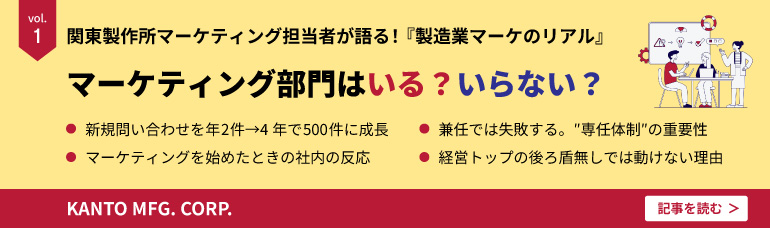 実際に関東製作所がマーケティングを始めた当初の話は、下記シリーズ『製造業マーケのリアル』の第一弾「マーケティング部門はいる?いらない?」よりご覧いただけます。