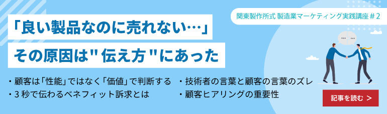 顧客目線での「伝え方」については、関東製作所式 製造業マーケティング実践講座#2で詳しく解説していますのであわせてご覧ください。