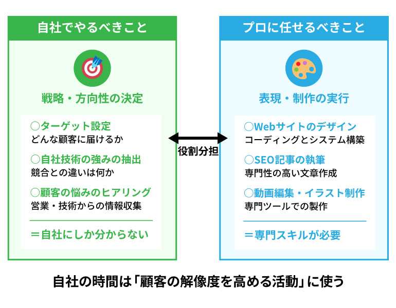 「何を言うか(戦略)」は自社で考え、「どう伝えるか(表現)」はプロに任せるのが基本です。