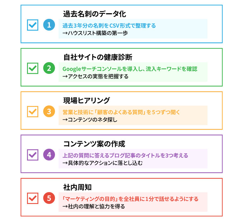 リソースが分散すると、どれも成果が出る前に挫折してしまいます。まずは自社の顧客が最も情報収集に使っているチャネルを1つ特定し、そこに全エネルギーを注ぎましょう。