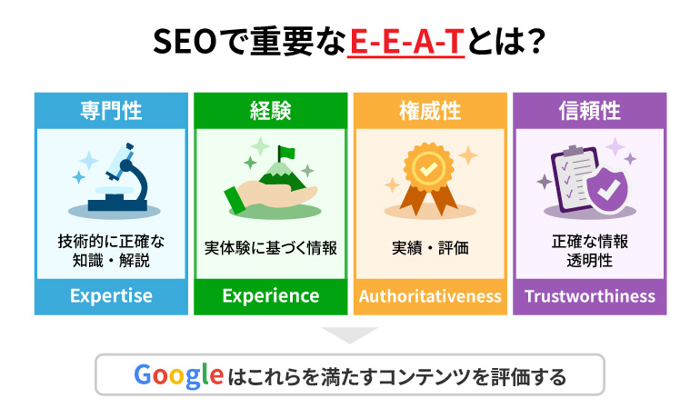 Googleをはじめとする検索エンジンは、近年「E-E-A-T」という評価基準を重視しています。これは、Experience(経験)、Expertise(専門性)、Authoritativeness(権威性)、Trustworthiness(信頼性)の頭文字です。