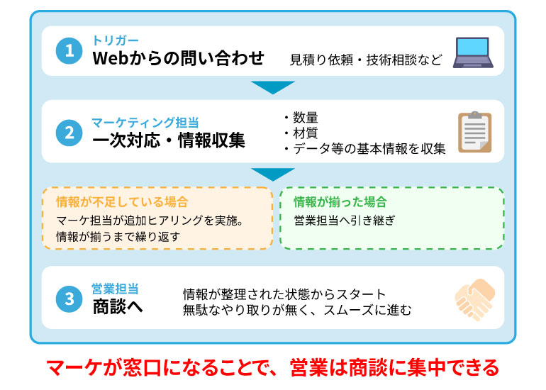 例えば、射出成形の案件で商談に入ったお客様から「ブロー成形も対応できますか?」という質問があった場合、マーケティング担当が基本的な説明を行い、詳細はブロー担当の営業につなぐといった役割分担ができます。