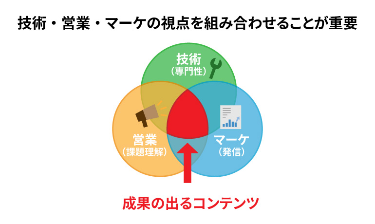 これら3つの視点が重なり合うことで、初めて「専門性が高く、顧客に響き、継続的に発信できる」コンテンツが生まれます。