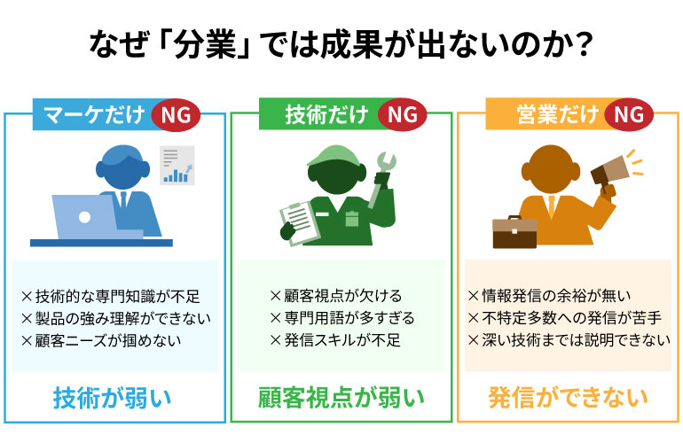 そう考えている製造業の経営者は少なくありません。しかし、製造業のマーケティングを成功させるには、営業・技術・製造の各部門が連携してこそ成果が生まれます。一つの部門だけでは「技術の専門性」「顧客の課題理解」「効果的な情報発信」の3つを同時に実現することはできないからです。