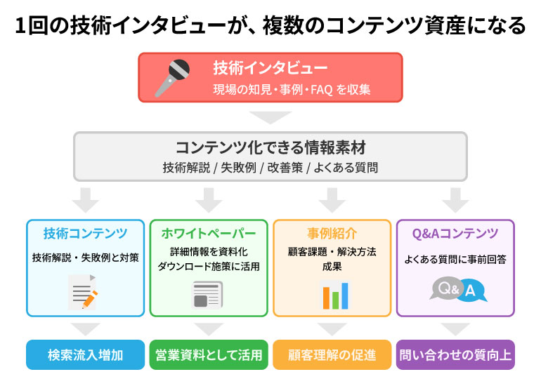 技術インタビューで得た情報は、技術コンテンツやホワイトペーパー、事例紹介、Q&Aコンテンツなど、さまざまな形でコンテンツ化できます。