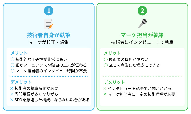 | デメリット | ・技術者の工数(執筆時間)が必要 ・専門用語が多くなりがち(顧客視点が欠けやすい) ・SEOを意識した構成にならない場合がある |