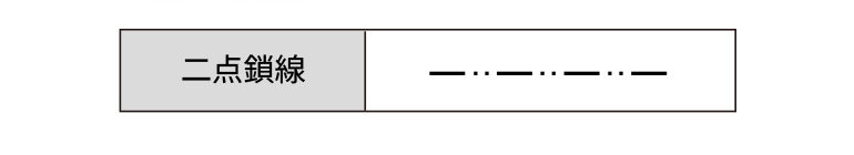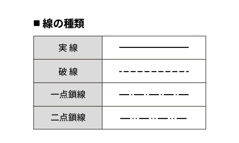 線の「種類」は、主に「実線」「破線」「一点鎖線」「二点鎖線」の4種類で、太さと組み合わせて用途が決められます。