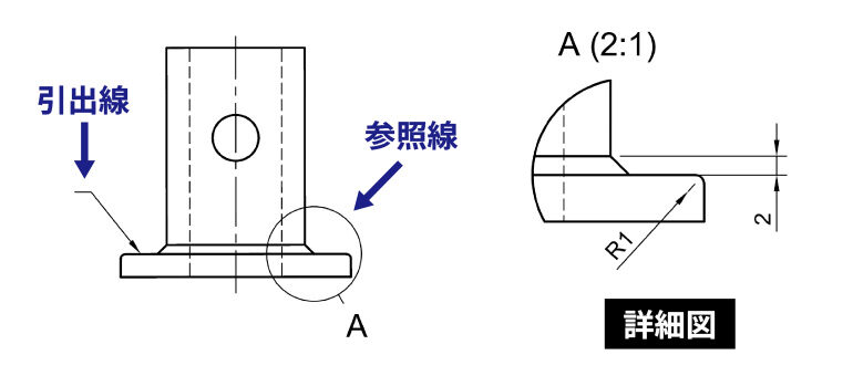 参照線は別の図面や別の箇所を参照する際に使用される線で、引出線と似た形式ですが用途が異なります。例えば、詳細図の位置を示す際に、全体図から詳細部分を円で囲み、そこから参照線を引いて「詳細A参照」などと記載します。また組立図において個別部品の詳細を部品図で確認してもらう場合にも、参照線を使って部品番号や図面番号を指示します。
