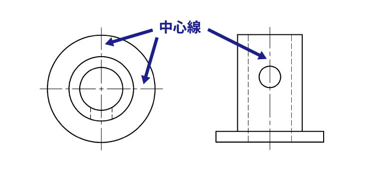 中心線は対象物の穴の中心位置や対称軸など、設計における基準位置を示すための線です。細い一点鎖線で描かれます。中心線を引く際の基本ルールとして、まず対称形状の対称軸には必ず中心線を引きます。たとえば円形の部品には水平方向と垂直方向の中心線を十字に引き、その交点が円の中心であることを示します。また円筒形の部品を側面から見た図では、回転軸に沿って水平方向に中心線を引きます。中心線は対象物の外形線を少し延長するのが一般的です。