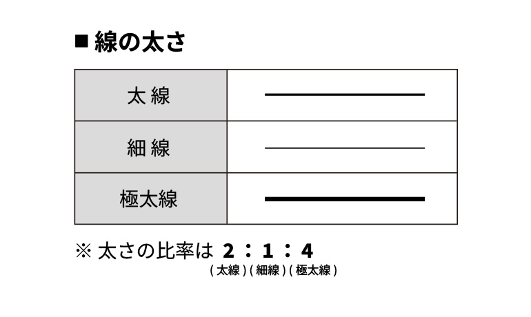 線の太さは「太線」「細線」「極太線」の3種類で、その太さの比率は2:1:4です。JISでは、0.13mm、0.18mm、0.25mm、0.35mm、0.5mm、0.7mm、1.0mm、1.4mm、2.0mmという9段階の線幅が規定されており、太さは図面のサイズに合わせて適切な組み合わせを選んで使用します。一般的にはA3サイズ以上の図面では太線0.5mm・細線0.25mm、A4サイズ以下では太線0.35mm・細線0.18mmといった組み合わせが多く採用されています。線の太さは一つの図面の中で統一させる必要があります。