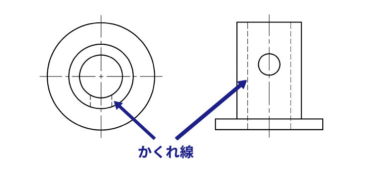 かくれ線は対象物の内部や背面にあることで、「見えない部分の形状」を表す線です。細い破線で描かれます。例えば箱型の部品の内側に貫通しない穴や溝がある場合、正面から見ると穴や溝は確認できませんが、破線で描くことでその位置と形状を表すことができます。かくれ線を使用することで、断面図を追加しなくても内部構造をある程度把握することができます。