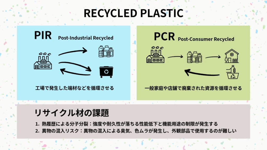 再生プラスチックは、一般的にPIRとPCRに分けて考えられます。PIRは工場内で発生した端材や工程ロスを再利用するもので、由来が明確で比較的品質を管理しやすいのが特徴です。一方のPCRは、市場で使用された製品を回収して再資源化する材料で、循環型社会への貢献度は高いものの、使用履歴や回収経路の違いにより品質のばらつきが出やすい傾向があります。