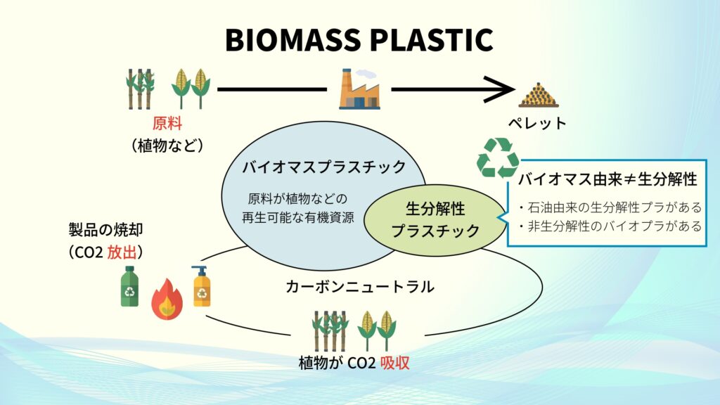 環境省では、バイオプラスチックを「バイオマスプラスチック」と「生分解性プラスチック」の総称として整理しており、バイオマスプラスチックはその中で「原料の由来」に着目した分類とされています。